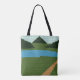 Imagem impressa no saco de tote é de uma foto de uma tapeçaria original que pendia em uma parede de crochê projetada à mão e Copyright © pelo designer publicado Delores Chamblin. A fotografia do único campo geométrico artesanal com prados verdes, colinas de montanha, lago azul e céu é reproduzida no saco.