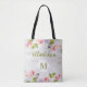 Nossa bolsa de tote monograma personalizada é adornada com uma madeira branca rústica, rosa, impressão floral verde e quadro branco para sua primeira apresentação. Personalize com seu nome e inicial. Veja nossa linha de produtos de cheio em nossa loja Zazzle.