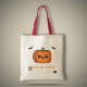 Um saco de tote de Halloween com uma abóbora fofa no estilo Kawaii, morcegos, gato preto e texto e nome personalizáveis de "Trick or Tratat". Perfeito para a noite do Dia das Bruxas assustar seus vizinhos e pedir doces para eles!