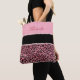 Esta bolsa de tote de na moda apresenta uma seção inferior de manchas-leopardo rosas e pretas. Separada por um primavera de pérolas é uma seção negra sólida. Outro conjunto de pérolas separa a seção superior, que é rosa. A seção cor-de-rosa é monograma com seu nome e inicial. O lado de trás é roxo e manchas-leopardo pretas e rosas.