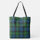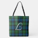 Saco colorido de tota de xadrez feito com o padrão tradicional azul, verde, branco e preto de latão Lamont. Um monograma de letras brancas solteiro, na frente da bolsa, está pronto para personalizar. Excelente para todos os fins.