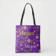 A arte tipográfica do nome e da flor impressa sobre sobre o saco, personaliza com seus próprios quatro curtos ou o nome de letra cinco, lê atualmente Megan. Arte e design do © por Sarah Trett para www.mylittleeden.com