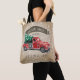 Esta sacola caracteriza um caminhão vermelho do vintage com uma árvore de Natal na parte traseira com flocos de neve do inverno toda ao redor. O texto na bandeira lê de "a família Williams" para personalizar com seu próprio nome. Um nome a personalizar está abaixo da bandeira e abaixo do trator lê, o "Natal 20xx". Adicione por favor o ano correto ao personalizar. O fundo é uma textura tan de serapilheira do falso. Projetado pelo artista mundialmente famoso Tim Coffey.