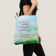 Serenity Prayer tote bag retrata uma cena natural com o sol a pôr-se sobre um campo. Ele apresenta a prece amada, "Deus, me conceda a Serenidade para aceitar as coisas que não posso mudar; Coragem para mudar as coisas que posso, E a Sabedoria para saber a diferença."