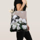 Shih preto e branco adorável Tzu enfrenta dentro entre a sacola dos amantes do cão dos rosas brancos