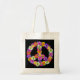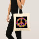 Um sinal de paz floral em tons cor-de-rosa, amarelo, laranja, roxo, verde, branco e preto adornam este saco de tote divertido. .