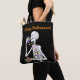 Um saco de tote de Halloween com meu personagem esquelético 3d tocando doce de Halloween. O texto personalizável da frente diz "Feliz Dia das Bruxas!"