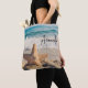 Um saco de tote com uma foto cênica. Um grande peixe-estrela colocado em pé numa praia arenosa. Um belo mar azul com ondas de surf branco no fundo.