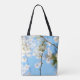 Um galho com uma flor branca de Magnolia completamente florida. Um galho promissor que fica por cima dele. E um fundo de muitas ramificações florescentes contra um céu azul. Fotografia Copyright ©2022 Kimberly J Tilley. zazzle.com/store/developingnature