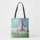 Uma ilustração de estilo vetorial do Matterhorn na Suiça. Este é o olhar de um poster de viagens retrô. Hikers caminhando em direção às montanhas, um carro a cabo pode ser visto à distância.