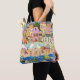 Divertido Sunny Beach Town com Happy Vacation Tourist Tote Bag apresenta pessoas que gostam de tomar banho de sol na praia enquanto olham para os coloridos barcos a vela, surfistas, cães e proprietários caminhando; enquanto as crianças brincam mostra apenas as poucas atividades que as pessoas gostam de fazer na praia.
