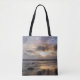 Um design fotográfico de um pôr do sol macio do sonho sobre o mar e refletido na água da praia. País de Gales.