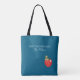 Imagine surprising your favorite teacher with this fun and heartwarming bag or buy it for yourself. Design features a customizable BEST.TEACHER.EVER saying and name along the top. It also includes cute, fun image of a bookworm reading a book on top of a red apple with a white heart in a watercolor style. The background is blue. Customize any of the elements. Perfect item to take everywhere!