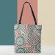 This nouveau style abstract design radiates movement in concentric circles and flowing lines in soft turquoise, coral, and cream tones.