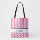 Saco de tote personalizado com design de bolinhas rosa e branco e uma borda branca e preta. Com as letras pretas, você pode personalizar com seu próprio texto. Um acessório bonito para quando você estiver em movimento!