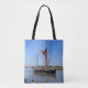Saco mostrando uma foto de um incrível Thames Barge. Estes barcos foram usados comercialmente no rio Tâmisa, em Londres. Os barcos são negros com velas vermelhas pintadas velejando sob um céu azul de verão.