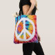 Um saco de tote vibrante com um sinal de paz arrojado contra um fundo de corante de gravata giratório. A mistura de azuis brilhantes, laranjas ferozes, púrpuras profundas e amarelos ensolarados cria um design vivo e atraente, perfeito para espalhar positividade e paz no estilo.