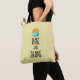 Um saco de tote com um design tipográfico fofo. Uma nuvem fofa e um sol laranja sobre um fundo amarelo-claro. Rise and Shine escrito em uma fonte de tendência legal.