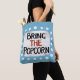"Traga a pipoca" é um design de texto fofo em azul claro com texto preto e vermelho, junto com uma forma de sotaque branca e pontos brancos texturizados ao seu redor.