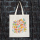 Esta bolsa de tote "A paz mundial começa na cozinha" apresenta uma citação com flores.