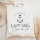 Dê as boas-vindas aos convidados para a sua despedida de solteira náutica ou de barco com essas bolsas de mão personalizadas fofas. O design apresenta uma ilustração de um navio azul-marinho encimada por um pequeno coração, com duas linhas de texto personalizado abaixo; mostrado com "Última Viagem Antes do Véu". Adicione o nome da noiva curvado na parte superior. As cores podem ser alteradas para combinar com as suas cores preferidas usando a ferramenta de design da Zazzle.