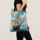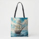 Um velejador de madeira atravessa as ondas sob o céu azul e nuvens de tempo justo nesta bela bolsa de tote. Perfeito para quem ama velejar.