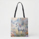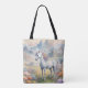Um saco de tote com uma imagem sonhadora de um unicórnio branco com um mano arco-íris em pé num campo de flores. Ao fundo estão montanhas majestosas. O presente perfeito para dar àqueles que amam unicórnios mágicos e místicos. Contém conteúdo generativo.