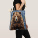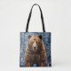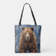 Trabalho de arte vibrante representando um urso com um casaco de pele rico e texturizado, colocado sobre um fundo de retalhos com tons azuis e cinzas. O urso é imponente e semelhante à vida, chamando a atenção com suas características realistas.