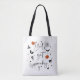 Um saco de tote de Halloween com uma pilha de lanterna, gato, morcego, aranha.