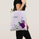 Linda bolsa romântica de tota com flores roxas e algumas folhas verdes. PARA MAIS PRODUTOS CORRESPONDENTES, clique na coleção acima ou entre em contato comigo