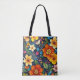 Uma representação artística vibrante de várias flores no florescimento do cheio, mostrando um espantoso conjunto de cores que incluem pétalas laranja, amarela, azul e rosa contra um fundo profundo e texturizado, complementado por folhas e flores pequenas para uma cena de jardim harmoniosa e viva