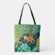 Saco de tote impresso numa design de tapeçaria William Morris de três cervos ao lado de um riacho numa floresta de fantasia de árvores em tons de verde macio e aqua, contra um fundo azul-índio escuro
