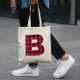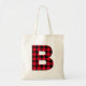 A bolsa tote com monograma apresenta uma letra B em negrito com uma sobreposição de xadrez de búfalo vermelho e preto. Um presente agradável para suas damas de honra em um tema country, ou casamento em um celeiro no outono.