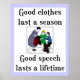 Boas roupas duram uma temporada, boa fala dura uma vida. Trabalho de arte de livros escolares de Vintage, na década de 1920, de uma mulher com dois filhos. Este ditado nostálgico ensina a importância da gramática inglesa.