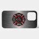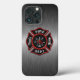Crachá de logotipo vermelho do Fire Department em fundo de impressão de textura com aparência de metal escovado. Excelente para bombeiros e primeiros respondentes.