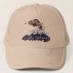 Um chapéu de arte de desenho azul e laranja de peixe voador estilizado. Lê apenas a pesca. Presente ideal para um fã de pesca de mosca. Arte original e design por Sarah Trett.