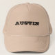 Um chapéu de caminhoneiro de cor khaki que diz 'AUSTIN' na frente. Você também pode design suas próprias fotografias, obras de arte, palavras e gráficos para criar um único chapéu de caminhoneiro americano! Há uma variedade de cores diferentes disponíveis para você escolher e elas estão disponíveis para homens e mulheres.