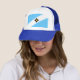 Chapéu com bandeira da cidade de Madison, Wisconsin; bandeira azul clara e branca com círculo preto e amarelo no centro