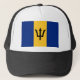 Bandeira de Barbados. A bandeira nacional de Barbados foi oficialmente adotada em 30 de novembro de 1966, o primeiro Dia da Independência da ilha. É constituída por uma tribanda de duas bandas ultramarinas, que supostamente representam o oceano; separadas por uma banda média ouro, representando a areia da ilha. Uma cabeça de tridente preta (normalmente chamada de "tridente quebrado") está centrada na banda do ouro. O símbolo tridente foi tirado do crachá colonial de Barbados, onde o tridente é mostrado com a Britannia segurando-o. A parte inferior quebrada simboliza uma quebra simbólica de seu status de colônia. Os três pontos do tridente representam os três princípios da democracia - 1) governo, 2) a favor e 3) pelas pessoas.
