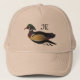 Um lindo pato de madeira nadando. A ilustração é feita do lado com uma onda de água negra das penas da cauda.