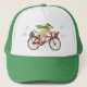 Hat de Feriado Humoroso. Cachorro bonito vestindo um chapéu verde listrado de inverno e um cachecol longo e pedalando uma bicicleta vermelha. O esquilo vermelho alegre está no cesto da bicicleta. Estes dois estão a caminho de entregar presentes de Natal aos amigos. Este chapéu original faz um presente divertido para os amantes de os animais.