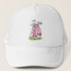 This all white hat features a stylish blush pink watercolor golf bag filled with clubs, sitting on a patch of green grass. The design includes a simple serif initial monogram placed right on the bag, making it feel like a natural part of the artwork. The letter is shown in a dark gray, almost black, to match the bag’s accents, but you can change it to any color you prefer.