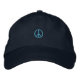 Um pequeno símbolo de paz bordado em um chapéu. Você pode mudar a cor do fio do bordado para combinar com o seu chapéu favorito. Design gráfico simples. Paz!
