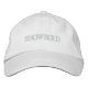 Um chapéu bordado clássico com o texto Snowbird. Adicione seu texto para um produto pessoal de um tipo.