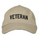 Bordado preto "VETERAN" no boné de khaki.