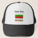 Bandeira búlgara com a palavra BULGÁRIA abaixo, nas cores branca, verde e vermelha da bandeira. Há um espaço para adicionar seu nome a uma aparência personalizada ou presente personalizado de um chapéu de caminhoneiro. A bandeira da Bulgária é constituída por três faixas verticais. Um é branco, o segundo é verde, e o último é vermelho.