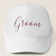 Um design de caligrafia incrível para um noivo, este chapéu branco de caminhoneiro é perfeito para você. "Groom" é escrito na frente usando uma letra cursiva de burgunday. Faça seu pedido hoje mesmo!