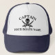 Personalize este chapéu yachting temático náutico do crânio do pirata do divertimento ou do capitão dos marinheiros da bandeira alegre de Roger com o nome de seu barco da vela ou de motor e personalize o modelo do texto dos capitães com um outro membro de seu grupo de navios. Personalize a cor do texto à coordenada com a cor de seu boné.