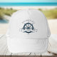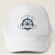 Um chapéu de férias de verão personalizado para seu cruzeiro de praia no oceano com um volante azul marinho de barco. Este chapéu náutico é perfeito para a reunião familiar de classe que corresponde às guardas para comemorar a viagem especial ou para um comandante de navio. Personalize com seu sobrenome e ano.