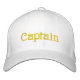 "Capitão" é bordado em ouro na frente deste boné de beisebol branco e inteligente. Disponível em uma grande variedade de cores.